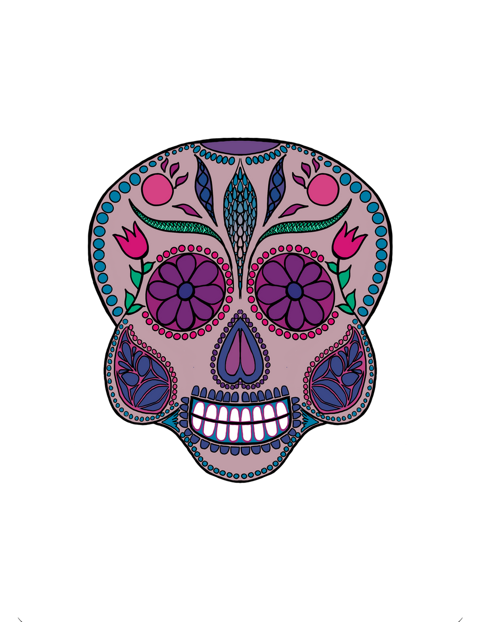 Vibrant and colorful skull art featuring floral and leaf patterns, sombrero, and abstract elements.